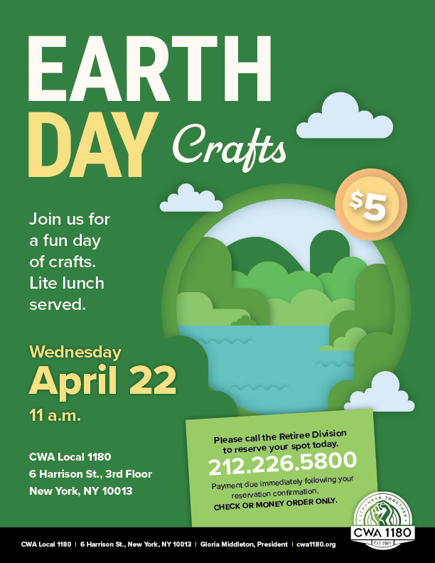Earth Day Crafts $5/person | CWA Local 1180 Call the Retiree Division to reserve your spot today: 212.226.5800 | |