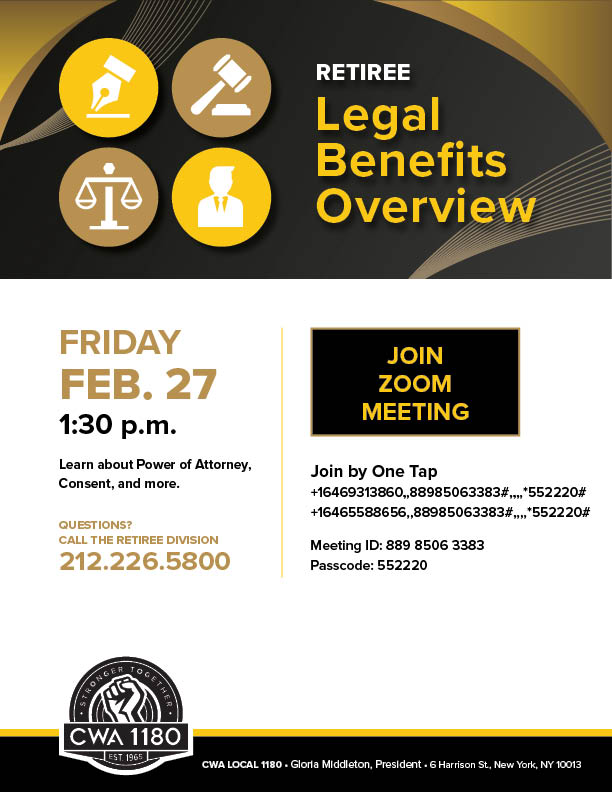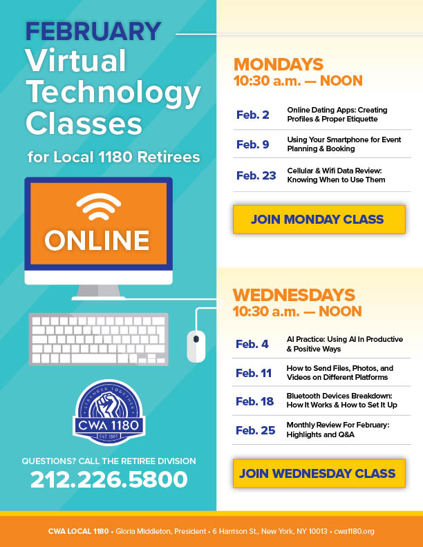 | Tues. 2/24 | IN-PERSON Review of Online Lessons / Q&A | 6 Harrison St. Call the Retiree Division to reserve your spot today: 212.226.5800 |