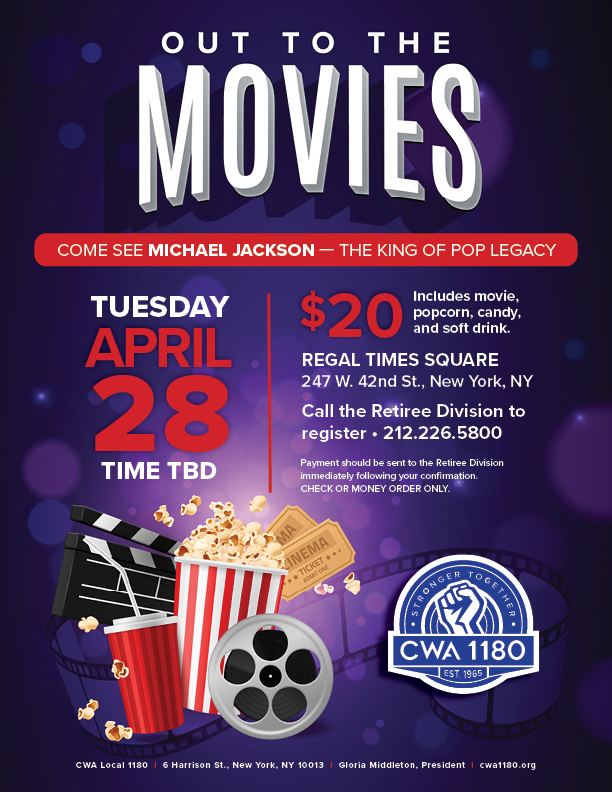 Out to the Movies - Michael Jackson $20/person | REGAL TIMES SQUARE Call the Retiree Division to reserve your spot today: 212.226.5800 | |